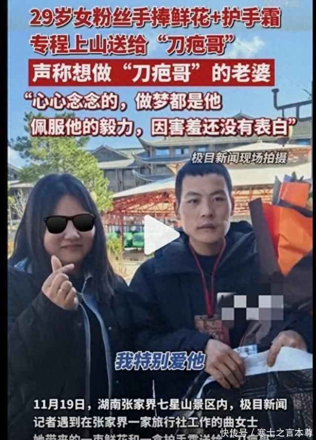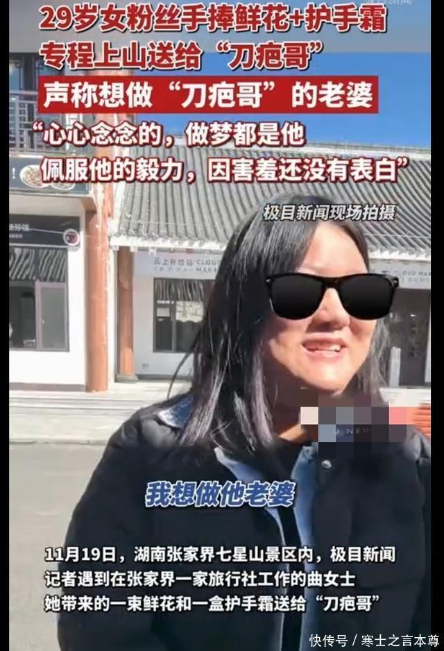 29岁的曲女士攥着鲜花和护手霜,在张家界七星山景区的山道上快步前行 。阳光穿过林间缝隙落在她脸上,映出藏不住的激动—— 她不是来旅游的普通游客,而是专程为了见荒野求生挑战赛选手“刀疤哥”杨小永,还藏着一个大胆的心愿:做他的老婆。